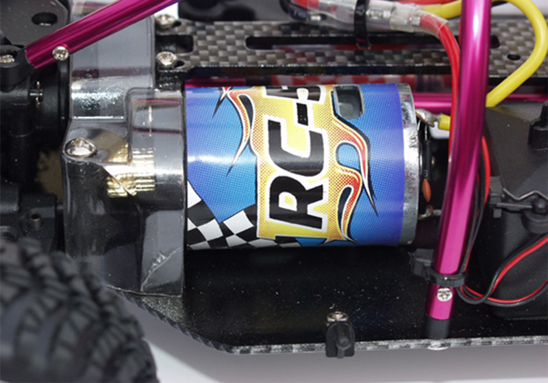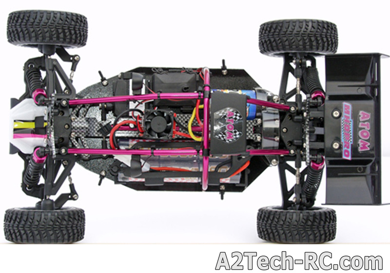 Dans sa version « Premier Prix » à moteur à charbons (Version Brushed ) l'ATOM est équipé d'un moteur électrique 540 avec pignon moteur et couronne de transmission protégés de la poussière.