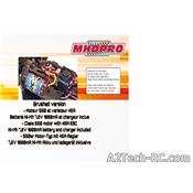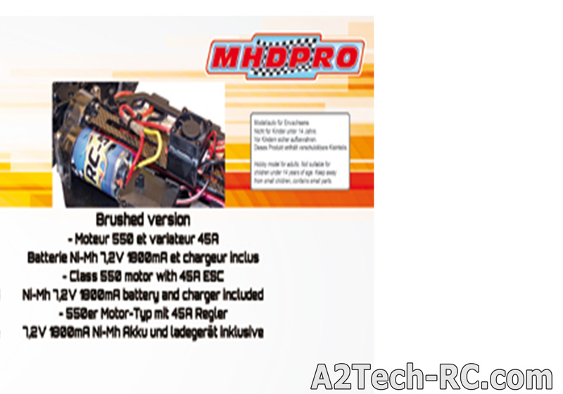 complètement assemblé avec moteur et radiocommande , servo de direction 3 kg et variateur électronique étanches à l'eau (waterproof), 4 roues motrices à transmission par cardan central, 4 roues indépendantes avec suspension à « Pivot Ball » (à rotules) au niveau du train avant, suspensions et géométrie réglables (pincement et carrossage à l'avant, carrossage à l'arrière), complètement sur roulements à billes, châssis en métal très résistant au look carbone, supports d'amortisseurs et plaques de direction et de renfort central de châssis en métal au look carbone, Roller Cage et cardan de transmission central en aluminium anodisé, carrosserie peinte et décorée avec 2 phares longue portée installés d'origine sur le « Roller Cage » à alimenter par la batterie de propulsion, support d'accu permettant l'utilisation de batterie NiMH ou LiPo (suivant les versions moteur), radiocommande MHD3S (3 voies) à volant en 2,4 GHz avec batterie LiPo 3,7V - 800 mA incluse pour l'émetteur et câble de charge USB.
