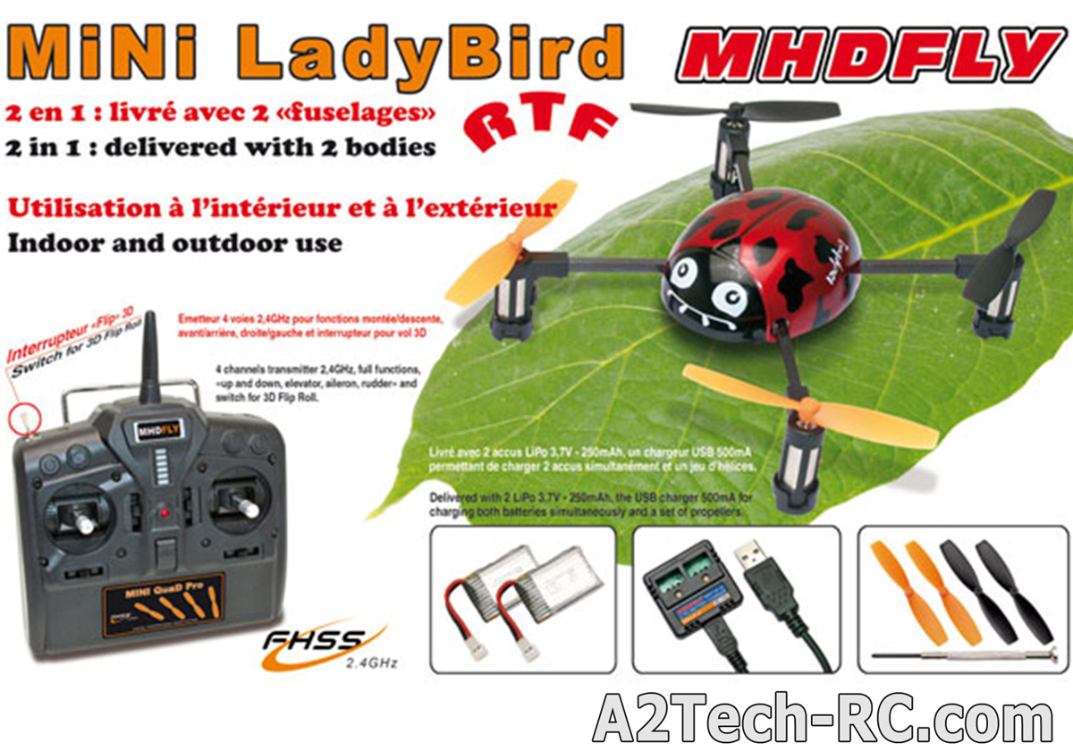 Mini Quad Pro RTF Mode 1 Marque modélisme MHD Ce petit etlaquo, Moustique etraquo, est dénommé Mini Quad Pro RTF ou LadyBird et mesure 10 cm sur 10 cm hors hélices.