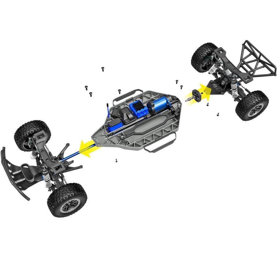 TRAXXAS Slash 4x4 VXL Brushed Short Course est un véhicule de course tout-terrain à l'échelle 1:10 qui combine puissance, vitesse et maniabilité grâce à sa technologie brushless avancée et son système de gestion de stabilité Traxxas Stability Management (TSM).